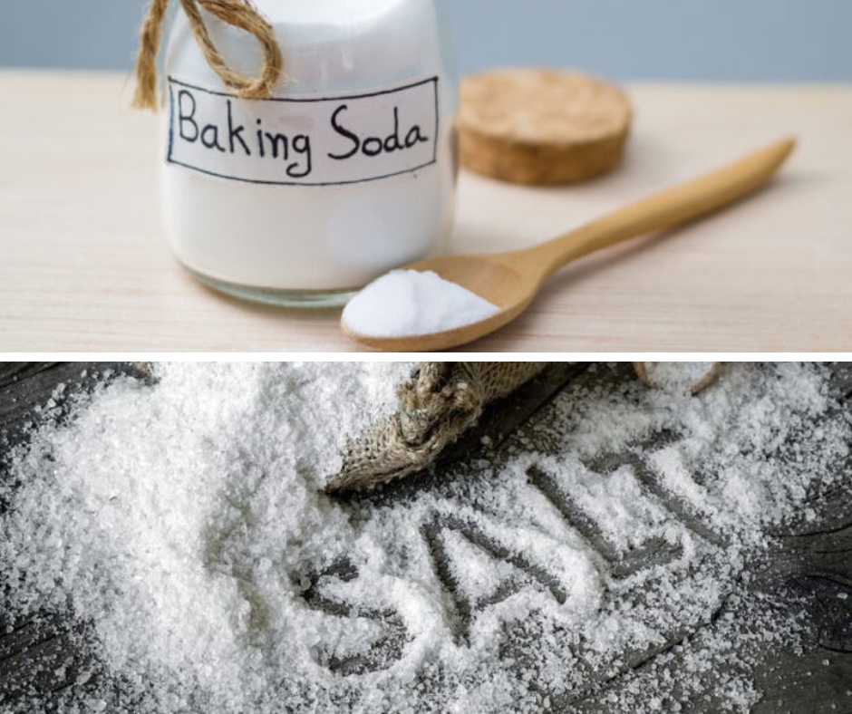 - Trộn đều 1 chén nhỏ baking soda với 2 thìa muối, ½ thìa dầu dừa.
