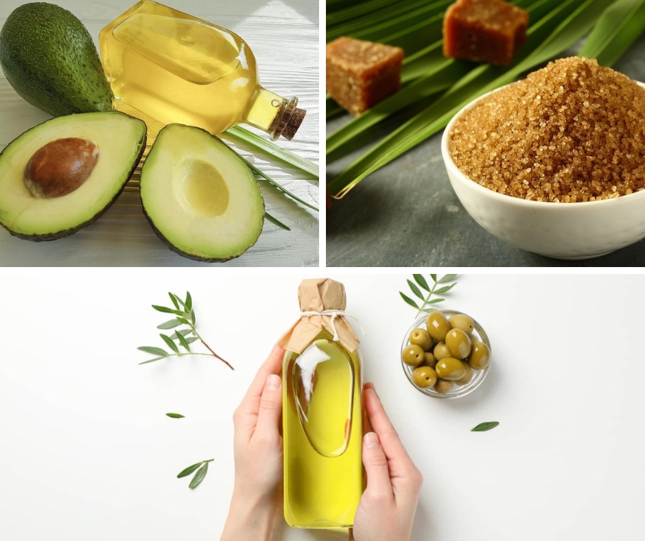 Sự kết hợp giữa các nguyên liệu dầu oliu, bơ, đường nâu sẽ tạo nên 1 loại mặt nạ cho da đầu và tẩy tế bào chết một cách nhanh chóng.