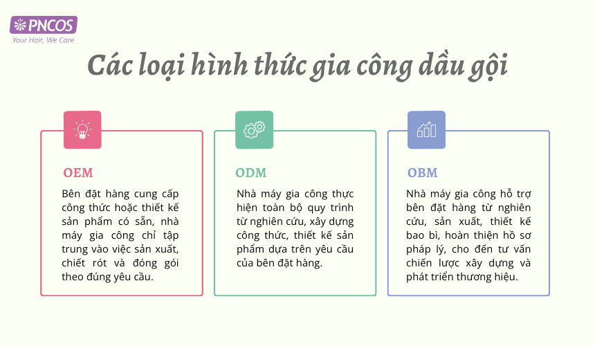 Trong ngành sản xuất dầu gội, hiện nay có ba loại hình gia công chính mà doanh nghiệp có thể lựa chọn để xây dựng thương hiệu riêng: